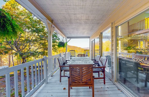 Escape to this stunning mountain retreat in Canton, NC, managed by Vacasa North Carolina LLC. Nestled on 23 forested acres, this spacious house offers serene living with breathtaking mountain and sunset views. As you step inside, you'll be greeted by vaulted ceilings and a cozy stacked rock fireplace, creating a warm and inviting atmosphere.