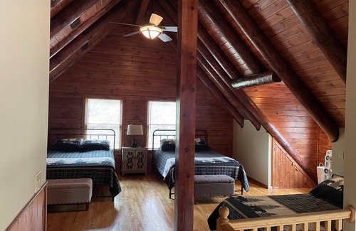 The loft, which features INCREDIBLE vaulted log ceilings, unique log cubbies and windows, has three queen beds.