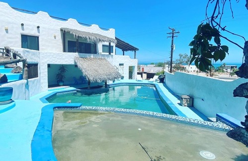 This custom built, stunning property consists of a large house and a casita for extra guests. The waterfall cascades into tiered pools, complete with swim-up bar (BYOB - bring your own bartender!). 8' privacy walls, multiple patios with relaxing sea views & custom Argentinian asado (BBQ) help complete the outdoor space. The garage, with parking for up to 8 cars, allows for ample toy parking for off-road enthusiasts. Main house has large, open living, dining and kitchen area, featuring commercial grade appliances, views of the Sea of Cortez, plus 3 large bedrooms and bathrooms - there's even a bonus bedroom and bathroom on the garage level. If your group is larger, there is a casita on the pool deck level, which comfortably sleeps 4 guests. Located in the Playas of San Felipe, it’s only a five minute drive to the Malecon for restaurants, shopping & entertainment and about a 5 minute walk to the beach.