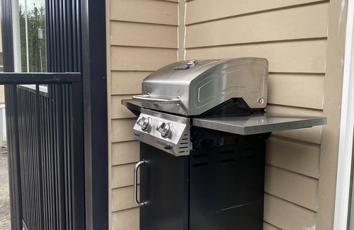 Upstairs, the brightly lit main floor features an open concept layout equipped with modern amenities and essentials. The living room has a 65” smart TV, Sonos speakers and lots of comfortable seating. Balcony with BBQ, fire pit and outdoor seating. The kitchen comes fully stocked with beautiful new Café appliances, dishwasher, microwave and cookware. The dining room features large windows and a solid oak dining table that seats 8- 12. The primary suite is also on the main floor which features a king bed, desk, accent chair, ensuite bathroom and large walk-in closet with mountain views!