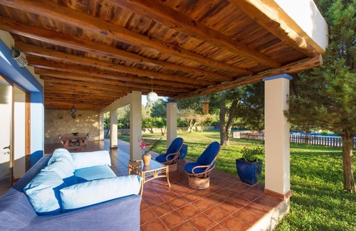 Nestled within Mediterranean greenery, the spacious villa “Casa Carla Ibiza” is located in a quiet area in Nuestra Señora de Jesús and is the perfect accommodation for families who are seeking a relaxing holiday. The property, which boasts rustic charm, offers a mountain view and consists of a living room, a very well-equipped kitchen with a dishwasher, 4 bedrooms (all with double beds and air conditioning), 3 bathrooms in the house (the main bathroom has a hot tub) as well as one bathroom with a shower outside by the pool and can therefore accommodate 8 people. Additional amenities include Wi-Fi, air conditioning, a washing machine, a fireplace, satellite and cable television with Canal+, children’s books and toys, a baby cot and a highchair. In your private outdoor area you will find a large garden with children’s swings, a covered terrace with a small outdoor kitchen with 2 ceramic hobs, a fridge, a wine fridge, a barbecue, a comfortable couch and a dining table. There is also an open terrace, a pool and an outdoor shower. The spacious, furnished patio invites you to enjoy delicious barbecued meals with your family and to end the evening with a glass of wine while you gaze upon the starry sky. A small selection of bars and restaurants can be reached in approximately 5 minutes by car and the nearest supermarket is located a 4-minute drive away (1.5 km). In approximately 10 by minutes by car you will reach the centre of the town of Ibiza where you will find a great selection of shops, restaurants, bars and cafes. Playa Talamanca beach awaits your visit just a 7-minute drive away (3.3 km) where you can spend the day with the whole family and create unforgettable holiday memories.