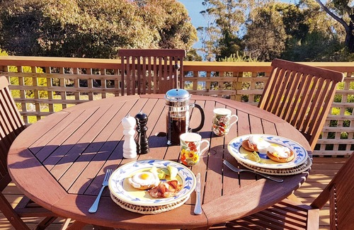 On entering the Beach House you are immediately drawn to the front deck and the stunning views over Georges Bay; your only company are the pelicans and kookaburras and the occasional sea eagle soaring above the majestic gum trees. The nearby holiday houses are obscured by bush and there is a secluded, winding track between you and the bayside beach. Your dog is free to explore on this beach.