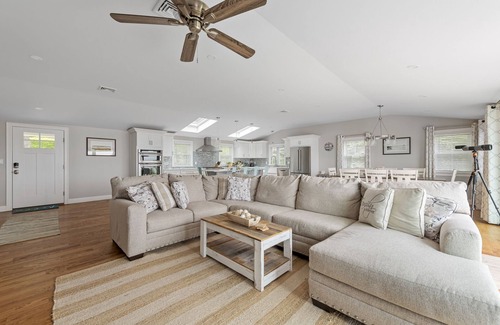 Enjoy a cup of coffee sitting in an Adirondack chair while watching the sunrise over the Westport River or a glass of wine on the outdoor sectional in the evening while watching boats go by. Enjoy using the fully equipped kitchen with seating for five at the large quartz island. The dining area's expandable table can comfortably seat eight. The family room features a 75” Samsung Smart TV and queen sleeper sectional with pillow-top mattress. The open floorplan kitchen/dining/family room allows for unobstructed views of the Westport River from the 16ft slider.