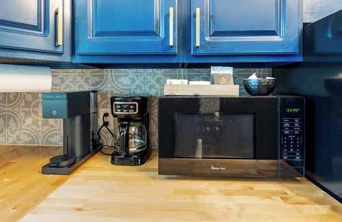 THE KITCHEN Attractive blue cabinets and quality wooden countertops await you in this modern space. Everything you need to prepare delicious snacks, meals and drinks is here for you, including fresh, locally-roasted coffee - what a great way to start each day for the coffee lovers in your group! There’s a table and chairs in the kitchen too where you can all gather to enjoy the snacks and meals you’ve created.