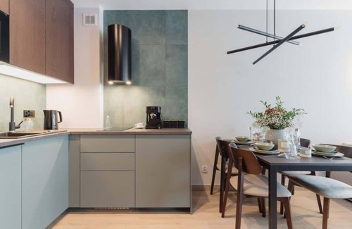 An apartment for 4 in a unique, modern investment. The restaurant consists of a living room with a sofa bed, a dining area and a kitchenette, a separate bedroom with a Queen-Size bed and a bathroom with a shower. The kitchen is equipped with the necessary household appliances, a coffee machine, a kettle and an induction hob.
