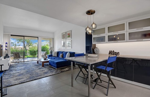 This beautifully updated 2 bedroom 2 bath single story condo at the lushly landscaped Sunrise Racquet club is just the Palm Springs getaway you've been looking for. The well stocked kitchen is right out of a design magazine with sleek countertops, cabinets and appliances. And the living area has modern yet comfortable seating and a large flat screen TV, plus a patio with no other units in view.