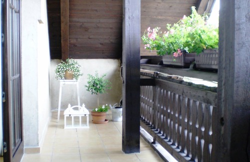 Wooden balcony; cosy wooden burner for winter months, wooden floors, garden