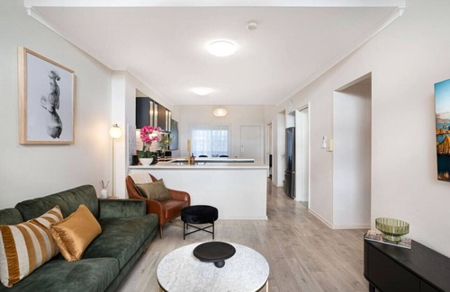 Retreat on Eden is a stylish 3-bedroom apartment nestled in the heart of Adelaide, ideal for a perfect holiday getaway. This chic retreat boasts a spacious living area with modern decor, comfortable seating, and floor-to-ceiling windows that flood the space with natural light. The fully-equipped kitchen features sleek black cabinetry, white countertops, and top-of-the-line appliances, making it a delight for any cooking enthusiast.