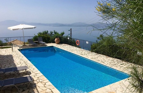 Villa Acantha has stunning mountain and unobstructed sea views and sits in an elevated position above the peaceful village of Nissaki. The interior has been lovingly furnished to an exceptionally high standard with the majority of the furniture being shipped from abroad resulting in good quality mattresses ensuring a comfortable nights sleep in the 3 bedrooms with en-suite bathrooms. All bedrooms benefit from sea views and glass doors to the outside, the first floor bedroom has dual French doors to balconies/large terraces and wonderful views. The villa has air conditioning, WiFi and Mosquito nets fitted to all windows. The luxury, high quality and well equipped kitchen with centre island, units with granite worktops is fully fitted with integral electrical appliances (electric oven, ceramic hob, overhead extractor fan, dishwasher, tall fridge/freezer) and the open plan lounge has comfortable sofas and a flat screen wall mounted TV (satellite - all UK and European speaking channels). The recent addition of two sets of large concertina windows in the sitting room enhances the amazing view which can now be enjoyed from all corners of the sitting room, dining room and kitchen. The grounds are extremely private with extensive patio areas around the large pool and some shaded areas to relax amongst the olive groves and for those who enjoy dining at home there is a large brick built barbecue and two separate outside dining areas with sea views. Villa Acantha has an excellent location for exploring this enchanting area of Corfu and the views from both the terraces and the spacious balconies are spectacular, the turquoise sea stretches out below and you can sit for hours enjoying the sailing boats returning to the marina or the sight of cruise liners arriving into Corfu Town just across the bay.