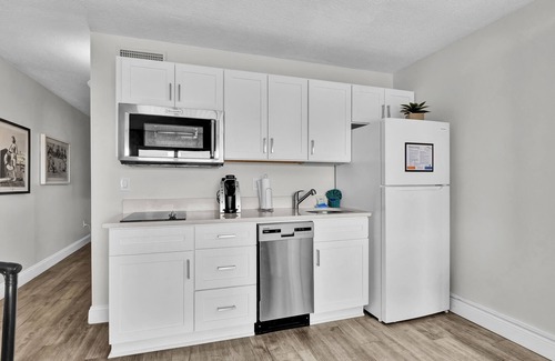 The king-size bed in the bedroom and the Murphy-style queen bed in the living room mean plenty of room to crash after a day of shredding or sunbathing. Two TVs make sure your crew doesn’t fight over the remote, and the updated kitchenette is ready for action, with a full fridge, microwave & convection oven, two-burner cooktop, dishwasher, Keurig, and even an ice maker to keep your drinks chill. Pots, pans, and all the basics are included if you’re feeling chef-y.