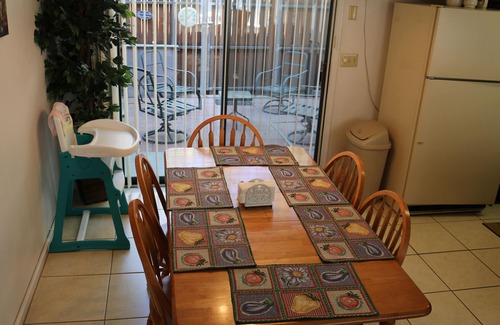 Open downstairs great room with fireplace, comfy living room furniture, fully furnished kitchen. Private patio off the dining room.