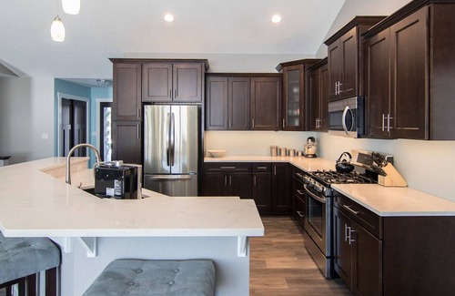 Experience everything Road America and Elkhart Lake have to offer. This 2,500+ sqft home finished construction in November of 2016. It has 4 bedrooms and 3 full baths, quartz counter tops and a great open concept layout that makes it easy to relax. The house has a brand new kitchen and island with quartz counter tops and all new stainless steel appliances. A master bedroom with a king bed along with a private master bathroom, tile shower with glass doors and his and hers sinks allow plenty of room for guests. The other 2 bedrooms on the main level share a full bath. Each of the spare bedrooms on the main level has 2 more beds. There is an additional queen bed/bedroom in the basement along with a full bath in the basement. The lower level living room features a 75" TV, bar with a beer fridge and access to the patio. This home comes with all the standard amenities including a washer and dryer and room to park several vehicles in the driveway.