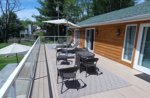 Large back decks and a covered lower patio to enjoy the lakefront breezes, sunsets, and stars here in the Catskills. Deck includes table seating and sun loungers. The patio under includes an outdoor kitchen, grill, and dining area. There is an outdoor firepit in the backyard.