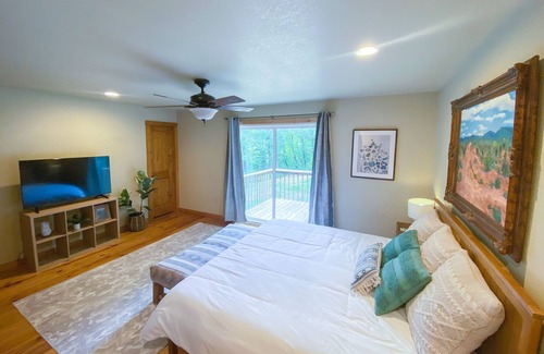 The cabin feels secluded, rustic, and so cozy. Our Master Bedroom has been tastefully curated with a king size bed, 55” smart tv, wicker lounge chair, extra blankets and pillows, a telescope for you to take out on the deck, and more! A second bedroom has a plush queen bed, and a third bedroom has 2 comfortable twin beds.