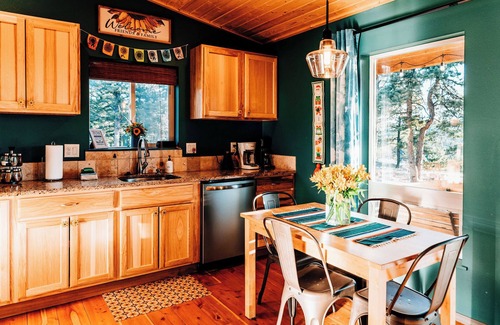 There is no picture that can really capture the beauty of this incredible stay. The cabin is on top of an amazing rock wall. The hot tub is set privately and in the perfect spot to see a full-spread view of Pikes Peak. The lot is filled with large boulders and a forest of pine and aspen trees. You can cozy up next to the fireplace or enjoy a fresh cup of coffee on the porch looking out at the valleys and mountains. This newly renovated cabin will not disappoint.