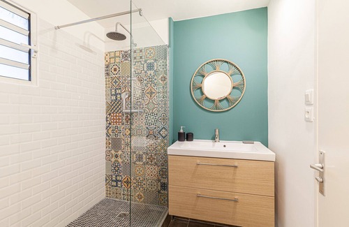 Pass my front door you will find the parental bedroom with shower room, an independent toilet, my air-conditioned living room with its dining area and care relaxation area. Then you will find my fully equipped kitchen and its laundry room with its washing machine. Finally you will discover my two other air-conditioned bedrooms with my storage space, a bathroom with Italian shower, toilet and finally my sunny terrace composed of an outdoor living room.