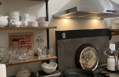 o Second cooking Chef's kitchen off dining room with industrial six-burner gas stovetop and oven, one refrigerator, triple industrial sink, open pantry stocked with basic supplies such as flour, sugar, spices, oils, paper products, dish soaps, condiments, garbage and recycle bags. Multiple pots and pans, mixing bowls, cooking utensils, mixer, and appropriate kitchen tools.
