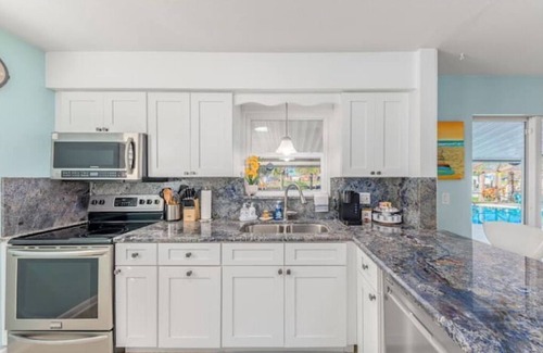 This house has two bedrooms, one bath, a full kitchen, a laundry room, and great living and dining areas, with a TV in each bedroom and living room for entertaining.