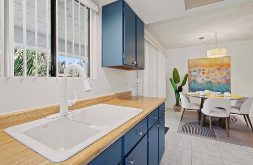 Inside, this home blends laid-back style with functionality. The living room features a plush couch and two inviting armchairs with an ottoman—perfect for movie nights in front of the smart TV. A desk sits by the window, offering a bright spot to work or journal during your stay. The kitchen greets you with cheerful blue cabinets, white appliances, and a Keurig for your morning brew. A dining table for four sits near the sliding glass doors, leading to a covered balcony where you can relax in comfortable seating and enjoy tranquil views of the garden and pool below. When it's time to wind down, the bedroom is your private retreat, complete with room-darkening shades to ensure restful sleep.