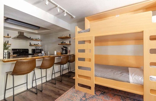Enjoy comfort and versatility in this thoughtfully designed studio featuring a full kitchen, private balcony, and cozy sleeping for all. A plush queen bed pairs with space-saving Murphy bunk beds—perfect for families or small groups. Ideal for adventurers seeking a stylish, efficient base in the mountains.