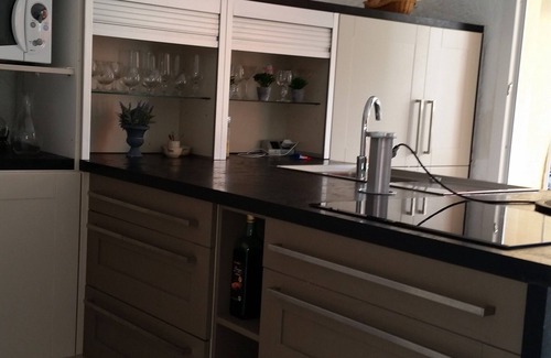 Living room with sofa bed, fully equipped new kitchen: micron wave, dishwasher, washing machine, air conditioning.