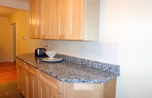 Spacious one bedroom apartment comprises entire first floor of the building. This home is fully equipped for two people to enjoy. The upgraded open kitchen is very well laid out to make for easy meal preparation, complete with dining room. Living room features a roomy sofa, love seat and cozy chair for relaxing or watching the large flat screen television. The bedroom is furnished with a king size bed with new mattress, many closets and a writing desk. The custom tiled bath has a sink, toilet, shower and linen closet. There is a front porch with natural gas barbecue for outdoor enjoyment. The sun room office at the back of the house is a great place for morning coffee and sun. Cable and wireless internet are provided. The home is fully stocked with linens for bed and bath as well as all kitchen necessities.