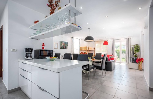 Surrounded by greenery and located in the small Istrian village of Bratuli?i is this beautiful vacation home. The tastefully furnished interiors extend over the ground and upper floors and each bedroom has its own bathroom and terrace. On the first floor, guests can enjoy a wellness area with a large jacuzzi and sauna, while the pool can be found in the fenced garden with beautifully landscaped flowers. The nearest beaches are easily accessible by car, so nothing stands in the way of wonderful beach days on vacation. In the immediate vicinity there are numerous bike paths where you can discover the local flora and fauna.