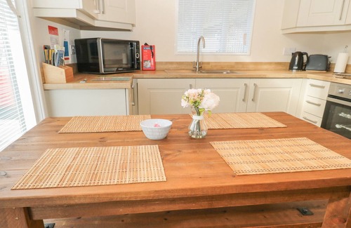 Amenities: Electric central heating. Electric oven and induction hob, microwave, fridge/freezer, washing machine. Smart TV with Freeview, Netflix, and WiFi. Fuel and power inc. in rent. Bed linen and towels inc. in rent. Travel cot and highchair available. Off road parking for two cars. Private decking with hot tub and seating. One well-behaved dog welcome. Sorry, no smoking. Shop 1.1 miles, pub 0.2 miles. Note: Barbecues and fireworks are not permitted on-site. Note: There are 5 steps up to the decking.