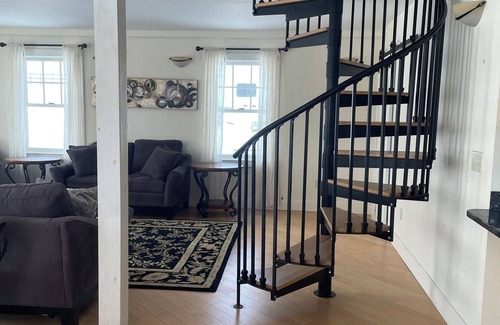 PS. Please be forewarned, the second floor is accessed by a circular wrought iron staircase (see photo), making it possibly unsuitable for the very young and very old…it IS possible to remain on the ground floor since the couch is a pullout and the first floor bathroom also has a shower, just please make your decision carefully, aware that little ones will always want to play on the stairs which may need to be monitored for their safety.