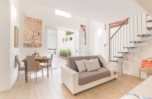 From the living room you can access the large exclusive patio, surrounded by plants and furnished with umbrella, table and chairs, where you can relax on the return from your strolls to discover the city, drinking a glass of wine or enjoying your dinner.