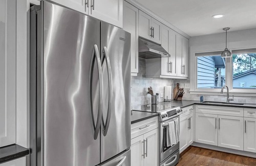 A full kitchen comes equipped with granite marble countertops & stainless steel appliances. Cookware, dishes, and glassware are provided, and meals can be shared around the dining table as daylight softens through the windows.