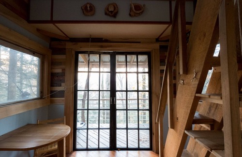 The Sylvan Float tree house is a treehouse in its purest form. Floating above the forest floor this arboreal abode is suspended between a red oak and hickory. With a full wrap around porch and cozy lofted room, the tree house is designed for two. Great views, fully enclosed room with heat, and a gas stove allow you to relax and feel at home after a day of exploring the gorge. Located five minutes from the Martins Fork trail head, spectacular hiking and climbing is not far after you leave the canopy and step onto the forest floor. Waking up in the tree tops has a magical effect you have to experience for yourself!