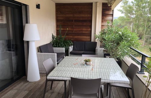 At the exit of Porticcio on the road to Propriano and 150 meters from the magnificent beach of Agosta, 15 minutes by car from Ajaccio airport, you will spend an enchanting stay in this beautiful new apartment of 82 m2 fully equipped . It is located on the 2nd floor in a secure luxury residence of 3 floors. Exhibition SO.