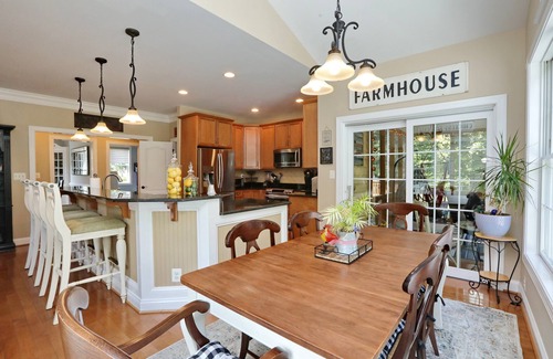 • Stocked Kitchen: Coffee makers, Blendtec blender, toaster oven, bakeware, cookware, and pantry basics. Opens to a screened porch with views of the pool and woods.