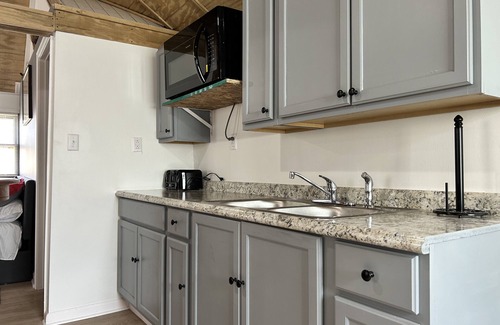 The fully-equipped kitchen area includes an electric stove, refrigerator, microwave, and coffee maker, ensuring that you have everything you need to whip up delicious meals during your stay. Once you've satisfied your hunger, head out to the front deck or gather around the fire pit in the back yard for an evening of relaxation and laughter.