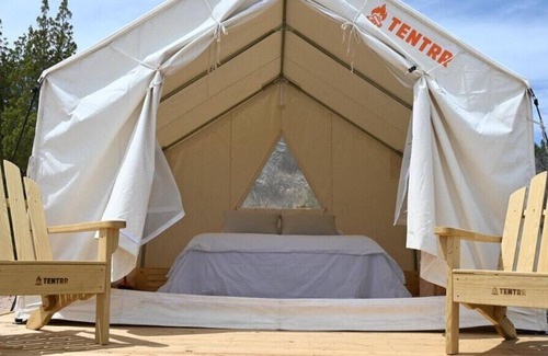 Your Tentrr campsite includes a 10'x12' (120 square feet) safari-style canvas tent on a raised wooden platform. Inside the tent you'll find one queen bed with a memory foam mattress. The tent is big enough for the bed plus one or two extra sleeping bags on the floor. Aside from the canvas tent, campers can also use the extra 5-person pop-up dome tent that’s provided. You'll also have a 6-ft picnic table, outdoor fire pit, and 2 Tentrr Adirondack chairs.