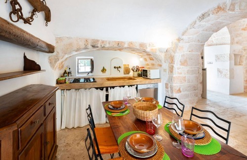This enchanting villa with a private pool, made up of a charming cluster of adjacent trulli, is a tribute to rural beauty and the understated elegance of local tradition—where every detail is carefully chosen to offer a unique, relaxing, and deeply evocative stay.