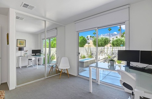The primary bedroom, separated from the two guest bedrooms, is a private retreat with access to the front courtyard and views of the mountains with a king-sized bed, ceiling fan, smart TV, and a closet with built-ins. The large ensuite features a dual-sink vanity and a step-in shower with a rain shower head. There are two comfortable guest bedrooms, each with a queen bed. They share the hall guest bath which includes a dual-sink vanity and a step-in glass-enclosed shower. If you need to sneak away to a private space, there is a dedicated office space with a fully functional workstation, including double monitors with a clear view of the front courtyard and the majestic San Jacinto mountains as your backdrop. It's the perfect space when you can’t completely escape from work or for simply reading or relaxing.