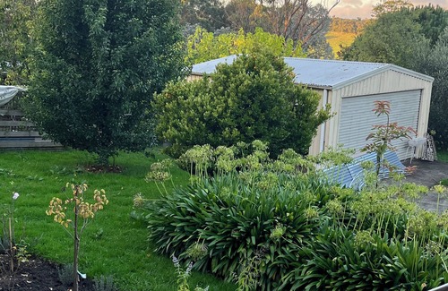 The cottage consists of three double bedrooms (5 beds) all with ceiling fans, heating and air conditioning , also, a living room (extra bed) with gas fire plus a 2nd large living/ family room with wood heater/ air con . The kitchen has been restored to its former glory, a country kitchen with a huge Falcon gas/electric oven with all modern conveniences, cooking utensils etc, The internal bathroom , laundry and large furnished deck overlook the rambling garden . Private vehicle access. Secure grounds.