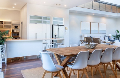 This large beach side residence boasts high ceilings with a sleek aesthetic design to take advantage of the abundant natural light and beach side position. Split across two levels with ample natural light, this spacious and modern home is beautifully presented. The light filled lounge room and dining room flow seamlessly to the outdoor area with bi-fold glass doors and frameless pool fencing which is perfect for entertaining and simply enjoying your holiday. The Beach Haus is the perfect holiday home for family and friends to relax and unwind all year round.