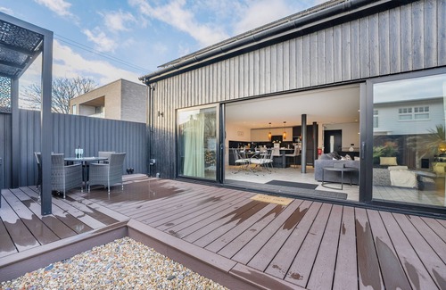 This property has everything you could wish for while on holiday, boasting a spacious open-plan living area with patio doors opening onto a tropical-themed enclosed garden with a covered hot tub and an infra-red sauna. Inside, the ground floor is airy and light-filled with underfloor heating. There is a comfortable seating area with a large sofa, an armchair and footstool, and a Smart TV. There is a separate dining table with seating for four and a kitchen with a breakfast bar and high stools. The kitchen is a cook’s dream and is fully equipped for preparing meals. There is a separate utility room with a washing machine, dryer and a stunning cloakroom. Clever concealed under-stair storage provides space for coats and shoes. Upstairs, from the mezzanine landing, there are two double bedrooms, both with an en-suite shower room and WC. Bedroom one has a super-king-size bed and a TV, and bedroom two has a super-king-size zip-and-link bed (which can be made into twins on request).