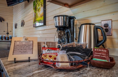 Stepping inside the front door, you will know your peaceful retreat has begun as you are surrounded by that familiar knotty pine. The living area has a sofa with reclining ends, and there is a separate recliner as well, offering very comfortable lounge seating for up to 4 Guests. There is a corner gas-log fireplace to enjoy on cool mornings when you're in the living room, and there is 32" Roku TV and very fast Wi-Fi for streaming your own channel subscriptions. The lamps have USB and Type-C charging ports.