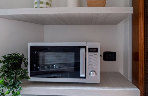 The living room is spacious and very bright, and it comes with a sofa bed and a dining table. Light comes from the balcony window, creating a relaxing and cosy atmosphere. Here the predominant color is white, showcased on both the walls and the tiled floors, which creates an interesting contrast with the gray furniture. The lovely kitchenette, coming with cream-colored furniture and tiles, is placed next to the day area and has everything you need to prepare your meals.