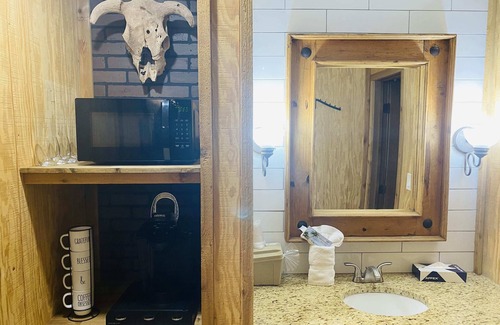 The Big Texan Airbnb is a picture worthy saloon style motel turned Airbnb. We created the room so that you have your very own coffee bar, plush king bed, and a smart 50in tv.