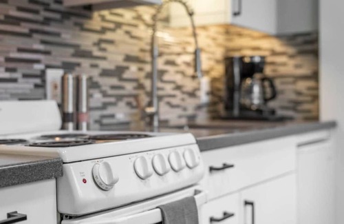 Twin studios, each with their own full bath, queen bed, smart TV, and dedicated entrance are connected via a well stocked kitchen which includes all your basic appliances and a beautiful, custom built breakfast counter which folds out into a larger dining table as needed during your stay.