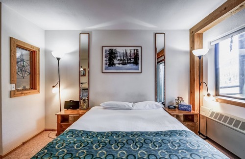 This studio comfortably accommodates a couple with one queen bed (brand new mattress) . The rustic décor adds charm, while the private balcony and wood burning fireplace allow you to take in the crisp, mountain air or cozy up when it’s time to wind down. The kitchenette is furnished with new dishware and a tall bistro table with seating for four. There are ski lockers as well. But what makes this particular studio so special is the decor. You can tell the owner loves her little studio and spent time making it look nice. She used "cabin-y" decorations that really make you feel warm. The Meadows also has a hot tub during the winter months but is not always guaranteed.