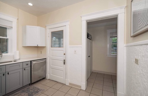 To the right of the entryway, you’ll find a lovely dining room complete with chic dining table set for 4. While not available for guest use, the antique fireplace is a focal point, having been kept in its original design. Through a set of pocket doors, the inviting living room awaits with luxurious sofa seating and a large smart TV. Whether you plan a cozy movie night in or just need an afternoon snooze after a day exploring the area, the space can accommodate either with ease. When ready for a bite, find your way into the updated kitchen equipped with stainless steel appliances, Keurig coffee maker, and stocked with all the cookware and dining ware needed for a delicious home cooked meal should you find yourself in the mood.