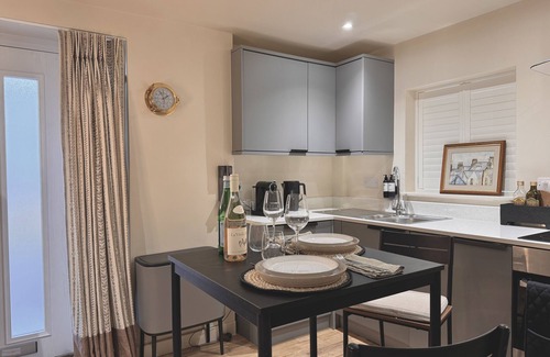 There is a large and well equipped modern kitchen with oven, and all the cooking essentials to serve up a romantic evening meal. Off the living space is the luxurious master bedroom, again with handcrafted joinery, storage and seating throughout. The careful design attention provides deep comfort and the perfect place to relax after a long day at the beach. The modern en-suite shower room is dressed with the level of detail present throughout the cottage.