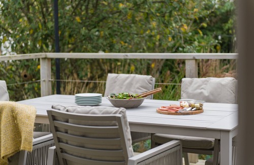 Outside dining table and chairs seating 6 and corner sofa with coffee table. BBQ.