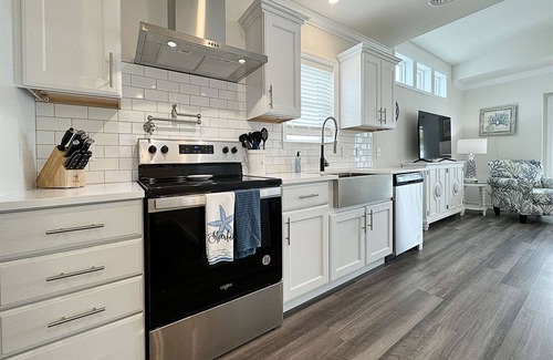 The interior of the home is tastefully furnished and appointed with high-end finishes. The kitchen and living area is fully equipped, featuring stainless steel appliances, a sleek range hood, a wine cooler, and stacked washer/dryer. Crown molding, recessed lighting, and premium vinyl flooring add a touch of sophistication throughout the residence. The living room is a cozy haven with skylights, a large flat-screen TV, and comfortable seating. The primary bedroom also provides a mounted Flat Screen TV. Sliding glass doors from the living room provide direct access to the riverfront balcony, blending indoor and outdoor living seamlessly.